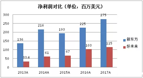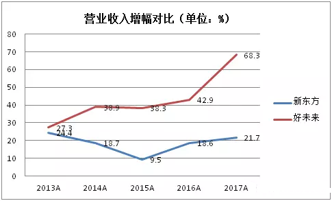 但是,从营收增幅情况来看,好未来的增速明显快于新东方,2014、2015年,好未来连续两年营收增幅大于38%,今年营收增幅比例更是达到68.3%;2015年新东方的营收增幅仅为9.5%,但是2016、2017两年的增幅逐渐企稳,并呈上升的发展趋势。