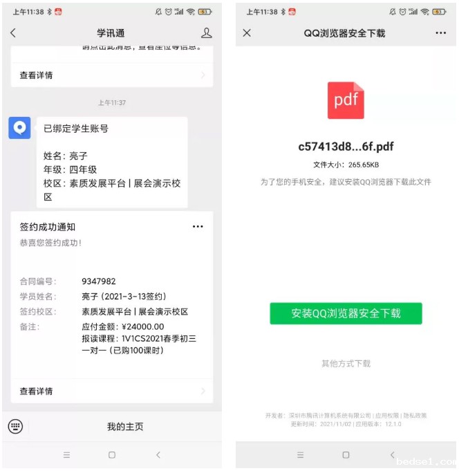 完成签署的合同会自动推送到学讯通公众号,家长可以随时查阅或下载到自己手机。