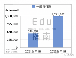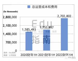 其中包括师资、教学设备与场地等为主收入成本为11.3亿美元,同比2021财年该时期的9.2亿美元,上涨23%。营销销售成本为2.8亿美元,同比2021财年同期2.5亿美元上升11%。变化最为剧烈的是一般与行政成本,该项支出高达12.9亿美元,同比2021财年同期的5.9亿美元,增加120%。该项成本的增长,业绩公布没有直接说明,但根据此前创始人在公开日记记录中,可以推测与数万人裁员的薪资福利赔偿相关。