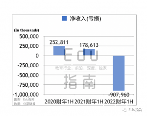 基于如此高额的支出成本,新东方公司2022财年上半年盈利状态表现为净亏损,亏损高达9.08亿美元。而2021财年同期表现为净收入1.79亿美元,2020财年同期表现同样为正,净收入2.52亿美元。