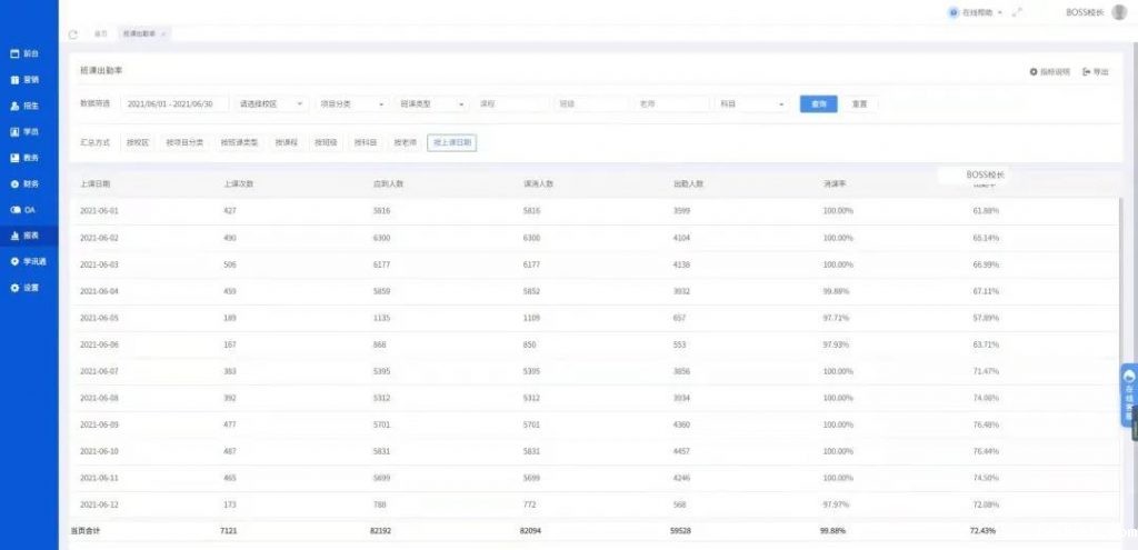 依据校区、上课日期、上课次数、应到人数、课消人数、出勤人数、课消率出勤率等分类标签BOSS系统会自动生成出勤报表!