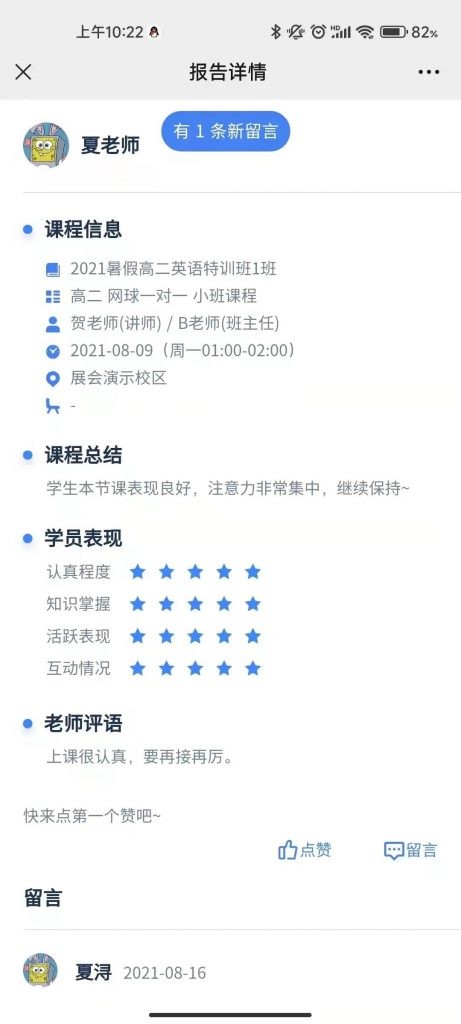 老师在课后对学员的学习反馈是家长看到自己孩子成长点滴的重要形式。