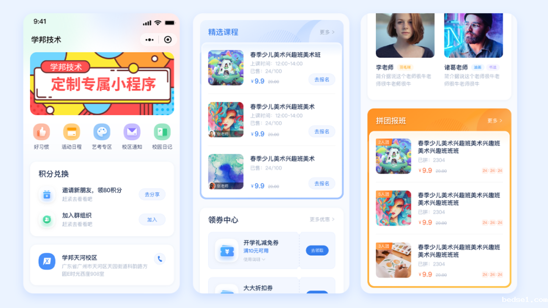 此外,除了潘老师介绍用到的活动报名、积分兑换、拼团报班,专属小程序的营销工具还有分销、报名表单、领券中心,推荐有礼等等。