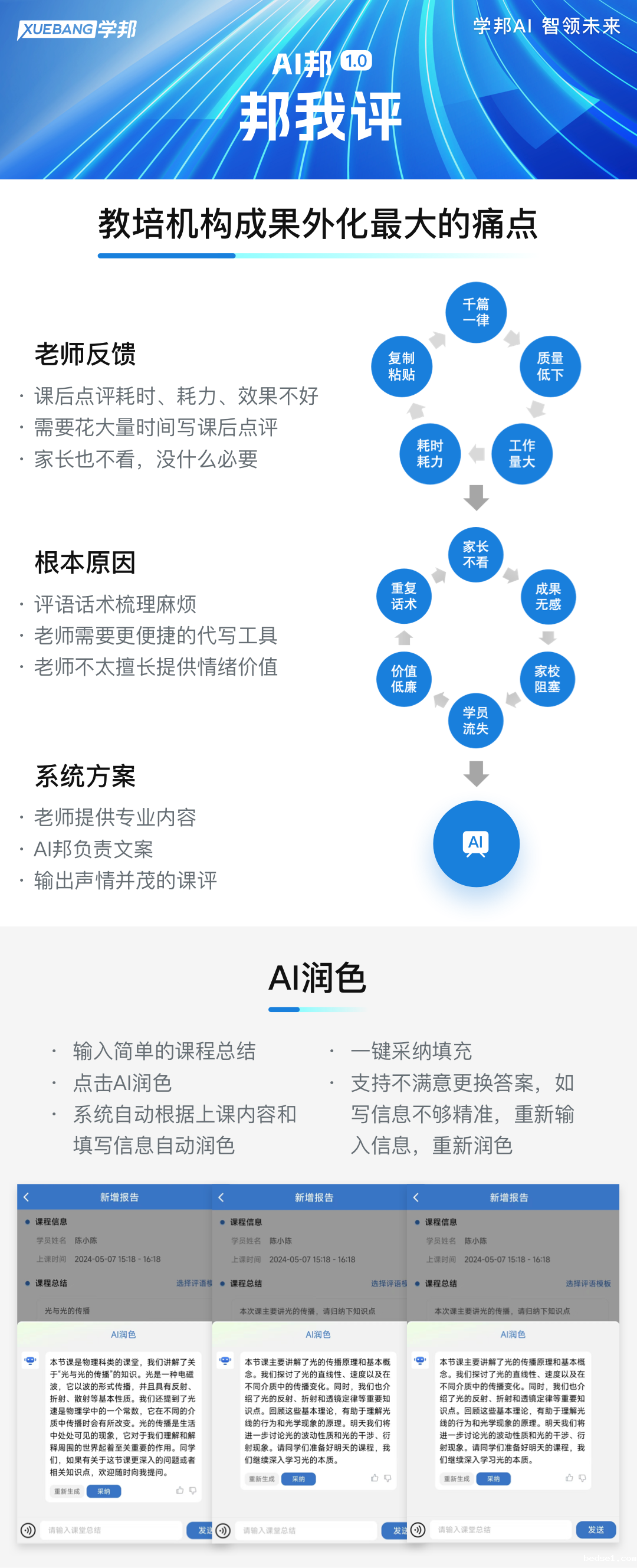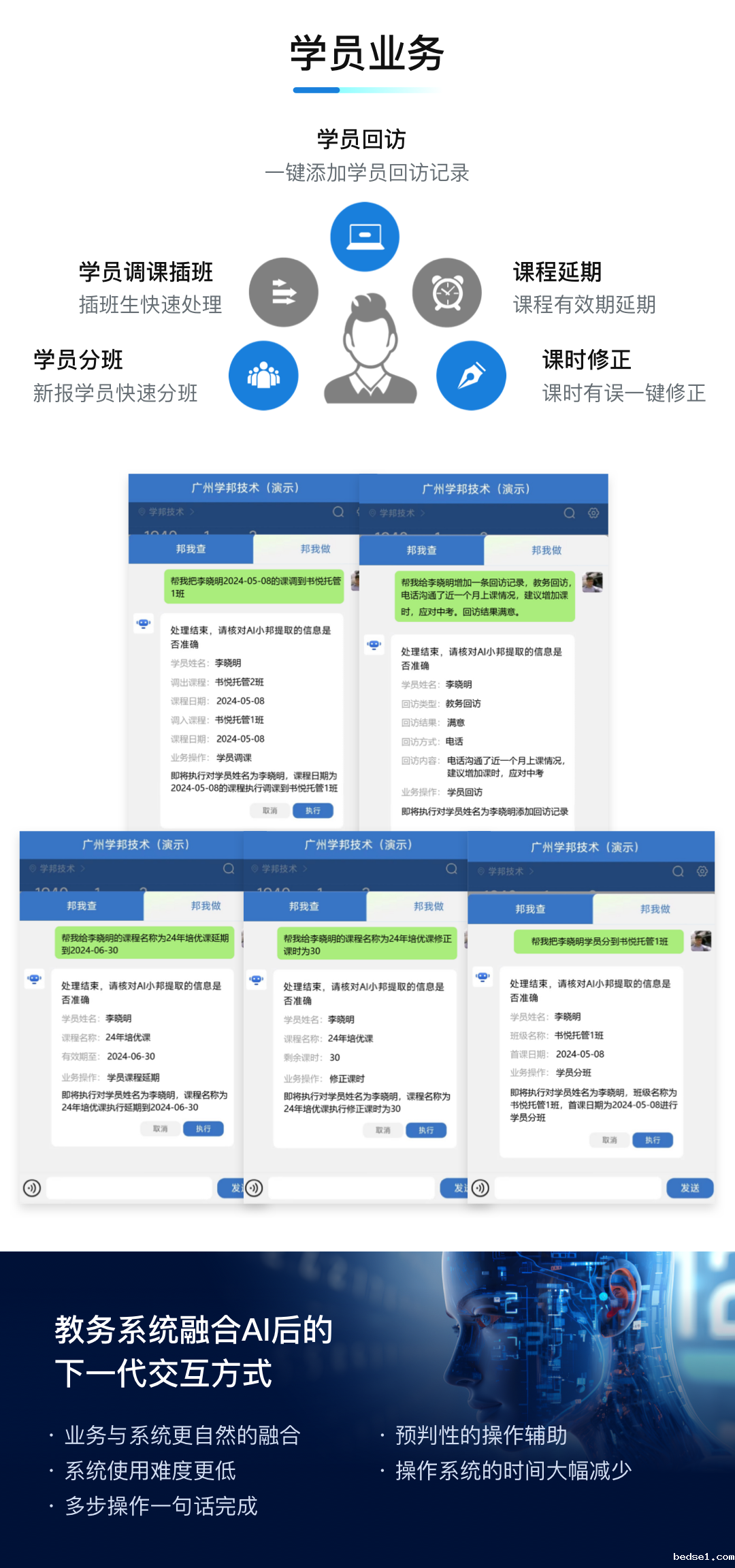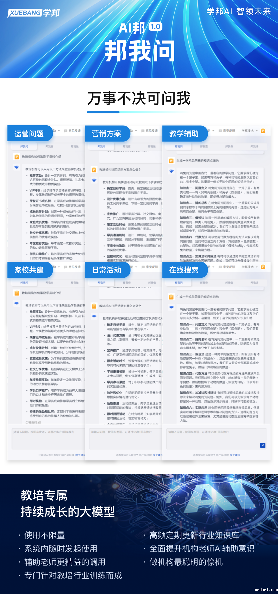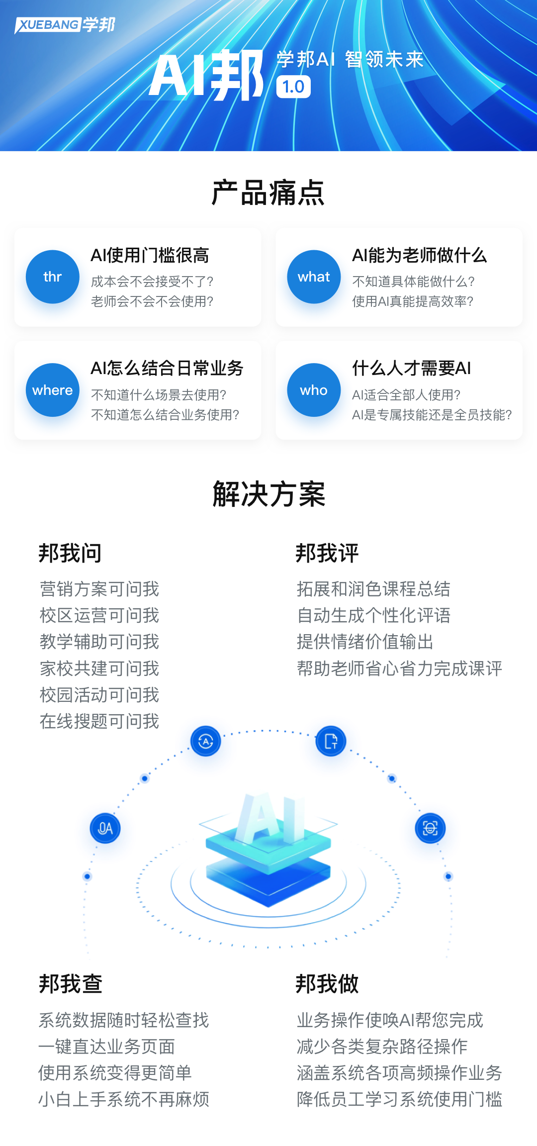 5月16日,伟德足球官网下载安装手机版技术再一次引领行业,发布教培行业教务管理系统AI落地应用功能 – AI邦,1.0版本包括邦我问、邦我查、邦我做、邦我评四大功能助力机构快速进入AI时代,用AI赋能教育机构发展!