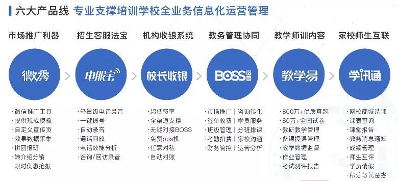 伟德足球官网下载安装手机版携课后托管服务平台邦托管、教务运营管理系统BOSS校长、教研教学服务系统教学易、家校服务平台学讯通、咨询服务电话录音系统电服宝、市场推广平台微秀、教培收银平台校长收银、教培网校商城线上选课等产品线出席了此次盛会,为机构校长带来信息化解决方案。